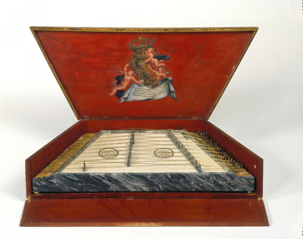 Dieses Exemplar ist insofern einzigartig, als es in allen seinen Teilen aus verschiedenen Marmorqualitäten statt aus Holz besteht, aus dem es normalerweise gefertigt wurde. Der Resonanzboden, in den die beiden Rosetten eingemeißelt sind, besteht aus einer Platte aus weißem Marmor mit statuarischem Charakter; das Gehäuse hingegen ist aus Bardiglio-Marmor; die Seitenteile sind aus brokatgelb Marmor. Über das Brett sind zwanzig Reihen von Saiten gespannt, die mit an den Fingern befestigten Plektren gezupft oder mit dünnen Hämmern angeschlagen wurden. Es ist wahrscheinlich, dass dieses Instrument von Anfang an vor allem eine dekorative Funktion hatte und ein Geschenk für Großherzog Cosimo III. de‘ Medici war, wie das Wappen und die Inschrift im Inneren des Gehäuses nahelegen. Es ist denkbar, dass es sich bei dem Hersteller dieses Exemplars um Michele Antonio Grandi aus Carrara handelt, von dem bekannt ist, dass er für den Hof der Este einige Instrumente ganz aus Marmor gefertigt hat.