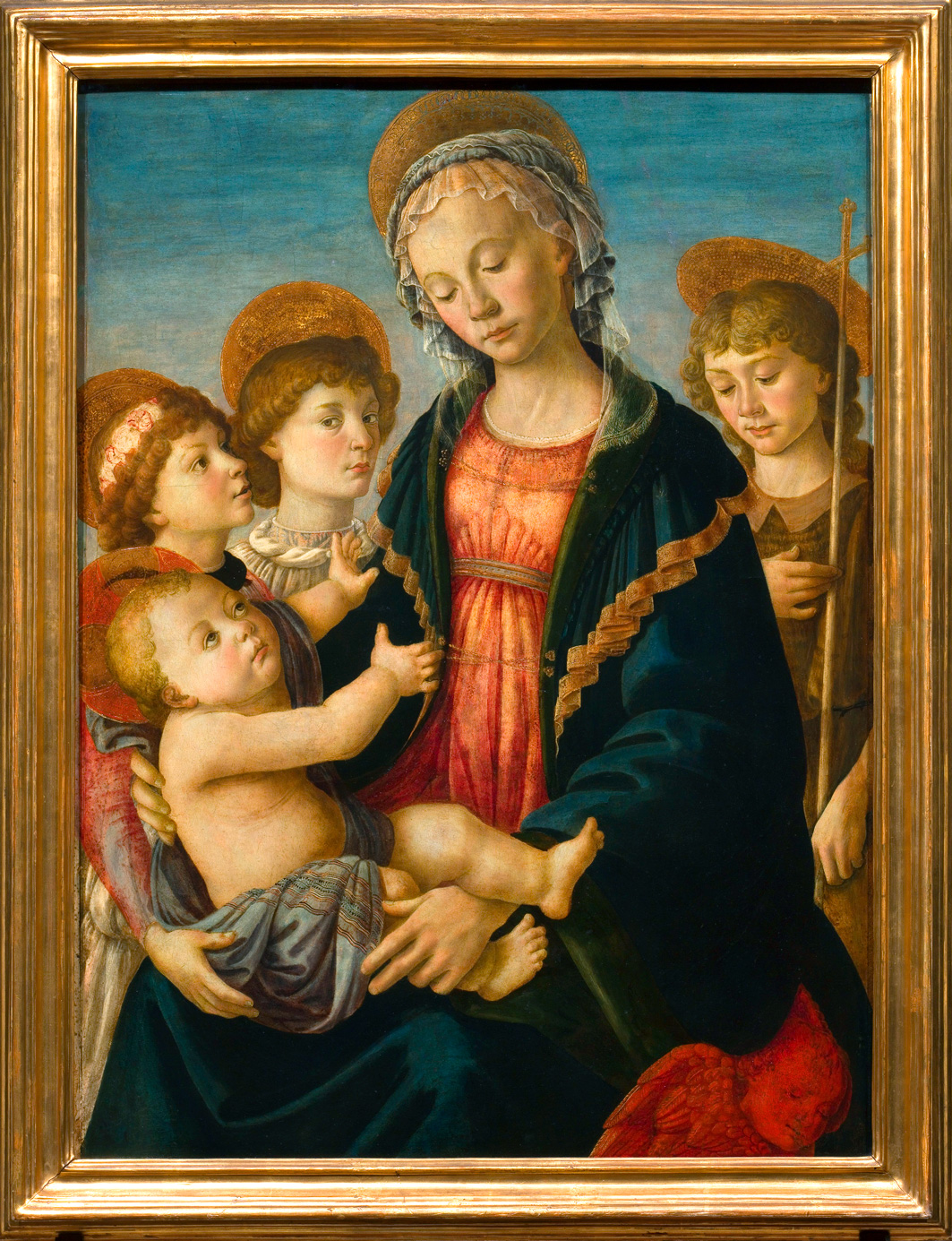 Bei dem Gemälde handelt es sich um ein „Kammergemälde“, das in einem Adelssitz zur privaten Andacht ausgestellt werden sollte. Das dargestellte Sujet, die Madonna mit Kind, umgeben von Johannes dem Täufer und Engeln, entspricht voll und ganz dieser Art von Werken, die nicht nur die religiöse Tugendhaftigkeit der Auftraggeber, sondern auch ihr soziales und wirtschaftliches Prestige zum Ausdruck brachten, in einer Zeit, in der künstlerische Objekte zu echten Indikatoren für materiellen Reichtum geworden waren. Auch die luxuriöse Kleidung der Jungfrau, die in der florentinischen Mode jener Zeit zum Ausdruck kommt, spielt auf diesen Zustand an.