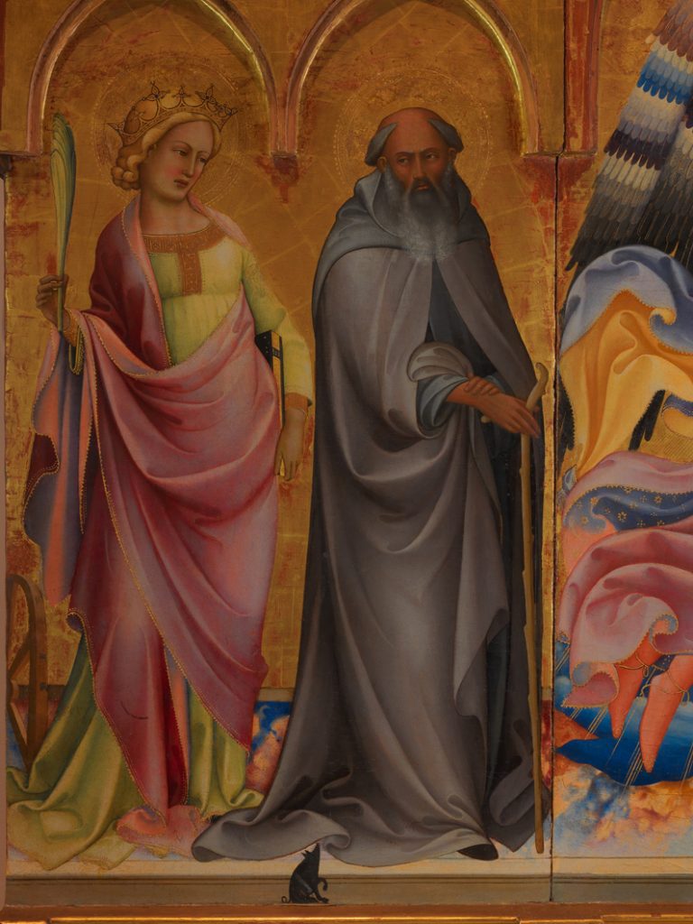 The central panel of this work depicts the Annunciation and is topped by a tondo with God the Father observing the agitated scene below. The miraculous event is concentrated on and enlivened by the emotions of the two figures. To the sides are two groups of saints: Catherine of Alexandria, holding the palm of martyrdom in her hand and with the cogged wheel at her feet; Anthony Abbot dressed in the garb of the Knights Hospitallers, with a wild piglet at his feet and holding a staff topped by a tau cross; Proculus dressed in his usual knight’s clothing and Francis, wearing the Franciscan habit and recognisable by the stigmata.