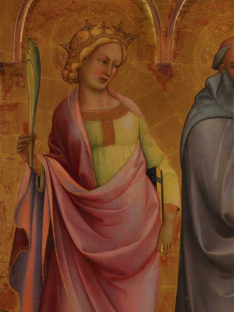 In the polyptych from the parish church of San Procolo, the figures are dressed in the brightly coloured clothing typical of Lorenzo’s work.