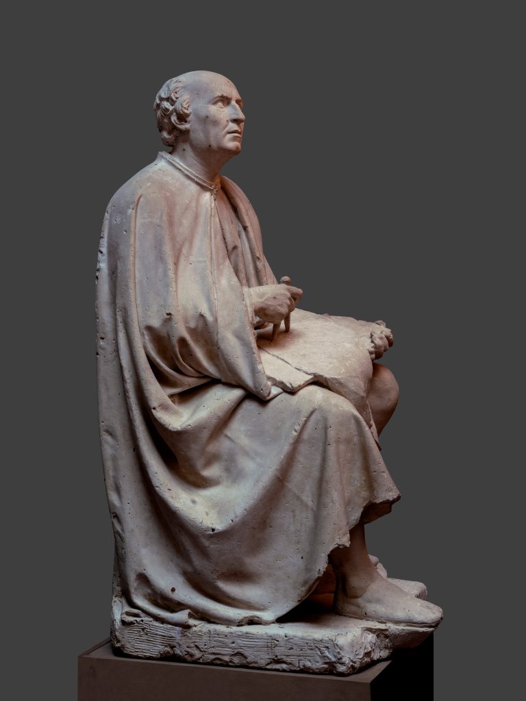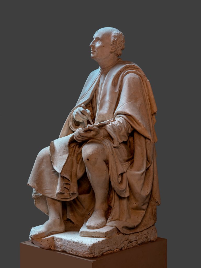 The plaster is a preparatory model for one of the two sculptures placed in the niches at the sides of the entrance to the Palazzo dei Canonici, built between 1824 and 1826 on the south side of the Florence Cathedral, depicting the cathedral’s two leading architects: Arnolfo di Cambio and Filippo Brunelleschi. While Arnolfo’s statue (the model of which is also preserved at the Galleria dell’Accademia) portrays the artist observing the foundations of the church, Brunelleschi’s statue looks up as he ponders the design of the dome.