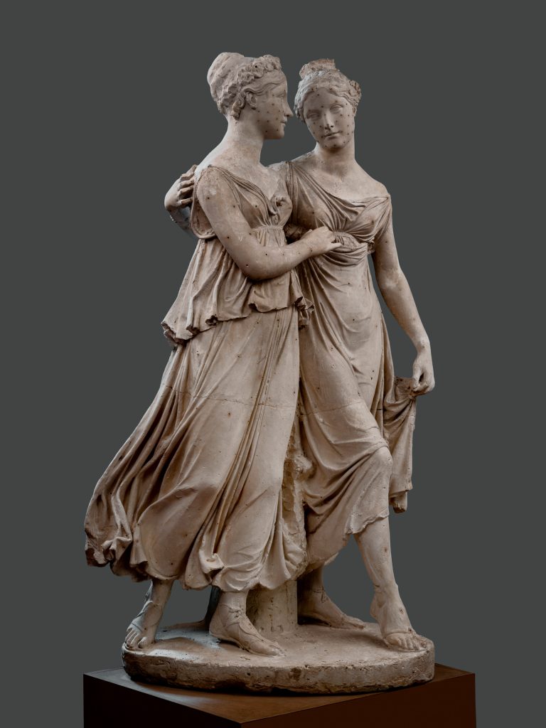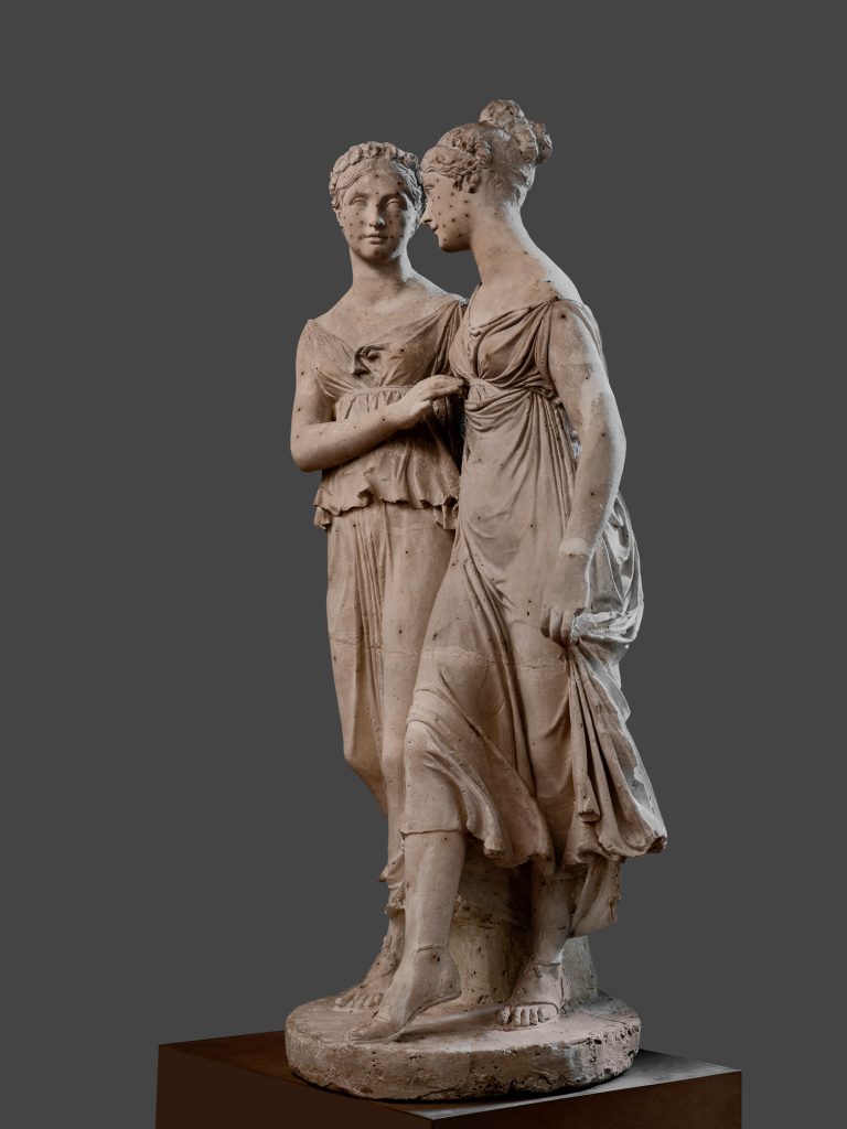 La composición del grupo remite a la famosa escultura de las Tres Gracias de Antonio Canova, en el corte de cuerpo entero y el abrazo afectuoso de las dos hermanas.