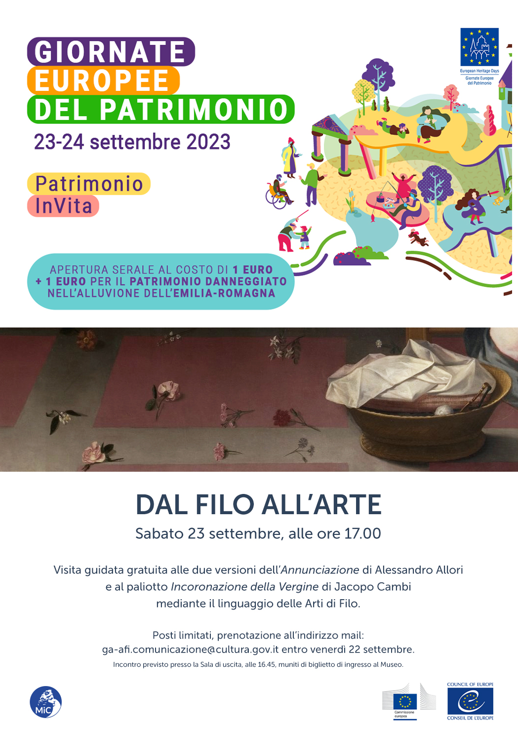 - Sabato 23 settembre, ore 17: “Dal filo all’arte”, una lettura inedita di alcuni dipinti presenti nelle collezioni del museo. Attraverso il linguaggio delle Arti di Filo, andremo alla scoperta dei segreti dei merletti dipinti nelle due Annunciazioni di Alessandro Allori e della stupefacente tecnica del ricamo con seta e fili in oro e argento eseguito da Jacopo Cambi nello splendido paliotto con l’Incoronazione della Vergine. La visita sarà guidata da Adriana Armanni, Fondatrice e Presidente della Corporazione delle Arti, associazione di categoria che tutela e promuove l’insegnamento di Arti di Filo (ricamo, merletto, tessitura e cucito non sartoriale), aiutata dalla Storica dell’arte Anna Giovannelli.